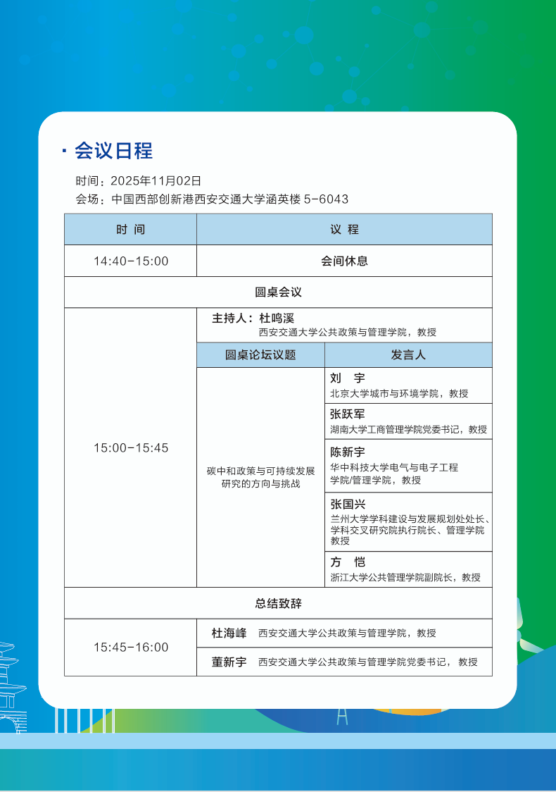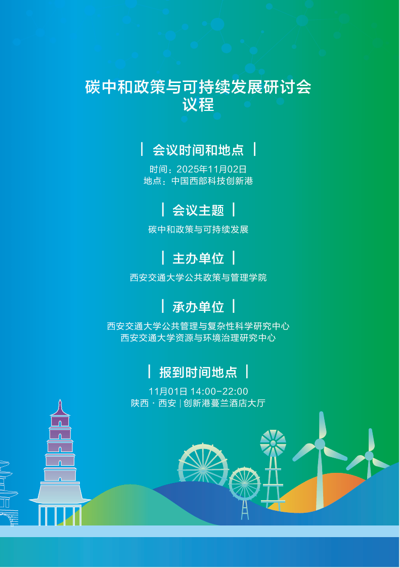 当前,我国正处在推动绿色转型、落实“双碳”目标的关键阶段。为有效应对碳中和战略与可持续发展进程中的机遇与挑战,亟需构建高水平的跨学科交流平台,促进相关领域学者开展深度对话与思想碰撞,分享前沿研究成果与实践经验,共同探索创新路径与系统性解决方案,从而为科学决策与精准施策提供坚实支撑。在此背景下,由西安交通大学公共政策与管理学院主办,西安交通大学公共管理与复杂性科学研究中心、西安交通大学资源与环境治理研究中心承办的“碳中和政策与可持续发展研讨会”拟于2025年11月2日举行。本次研讨会以“双碳目标下的政策创新与绿色转型”为主题,将重点围绕碳中和政策实施路径、能源结构转型机制、绿色金融发展模式、低碳技术前沿创新、产业升级动力机制以及国际合作经验借鉴等议题展开深入探讨,聚焦我国碳中和与可持续发展政策体系的构建路径与实践探索,助力实现绿色低碳高质量发展。
