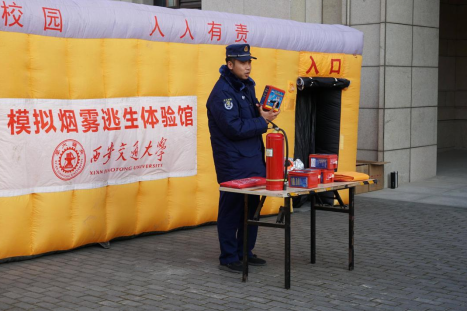 讲座结束后,同学们来到泓理楼进行安全演练。保卫处老师手持灭火器、防毒面罩等消防设备,严肃认真、严谨科学地向同学们讲授了相关设备的使用方法。同学们积极参与到模拟烟雾逃生和模拟灭火演习等体验活动中,通过实践提高了应急响应和处理能力。